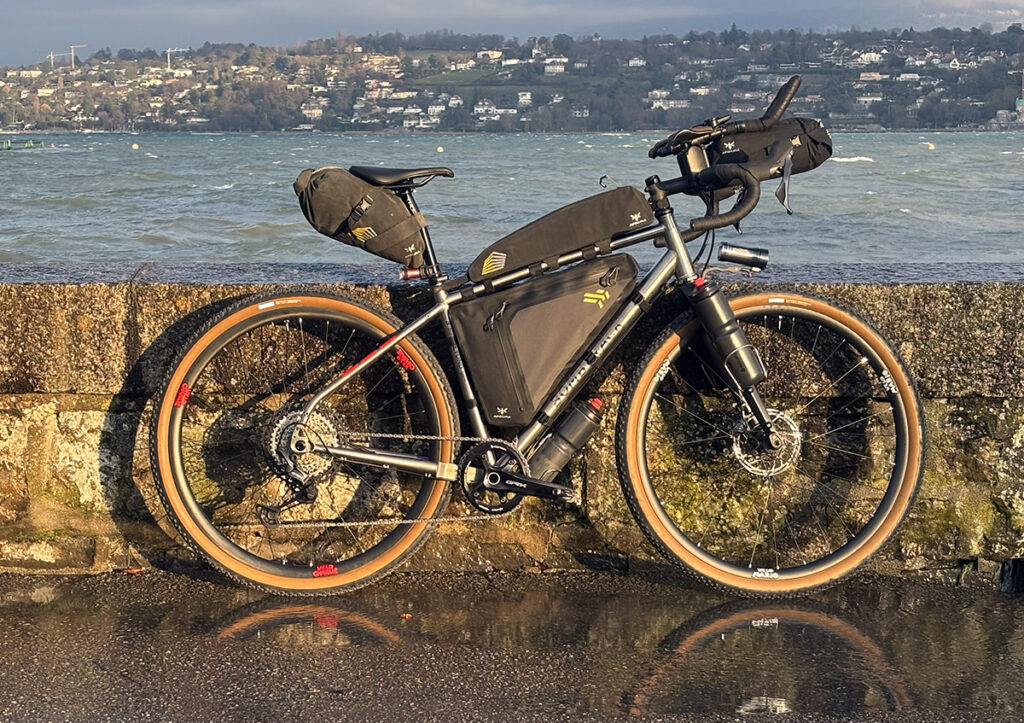 The frame is a titanium Bombtrack, equipped with a Seido MGV fork. The wheels were custom-built in Bern. The bags are from Apidura, and Adrien uses a Coros GPS.