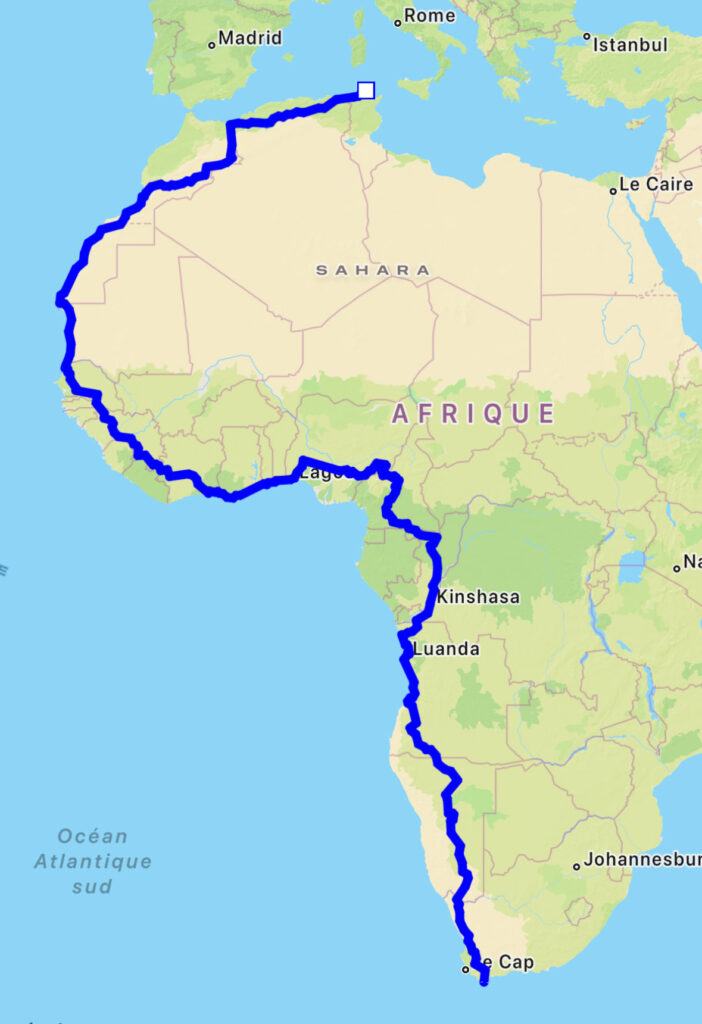 Ahead lie 17 countries, a distance of 16,800 km (10,500 miles), and over 90,000 m (300,000 ft) of elevation gain. Adrien chose a coastal route to avoid the deserts and jungles of the continent’s interior—and also in consideration of the political situation and ease of passage in various countries. This adventure is a long-held dream and an incredible challenge.