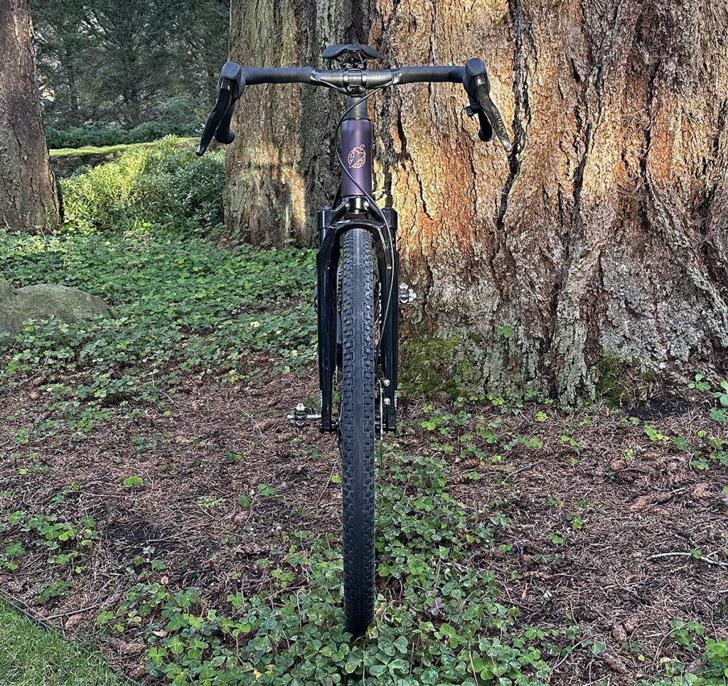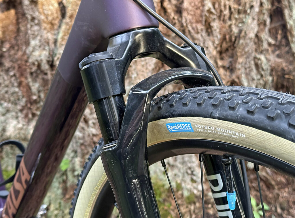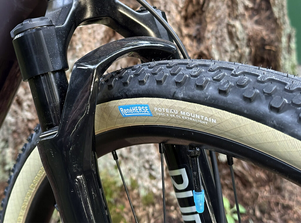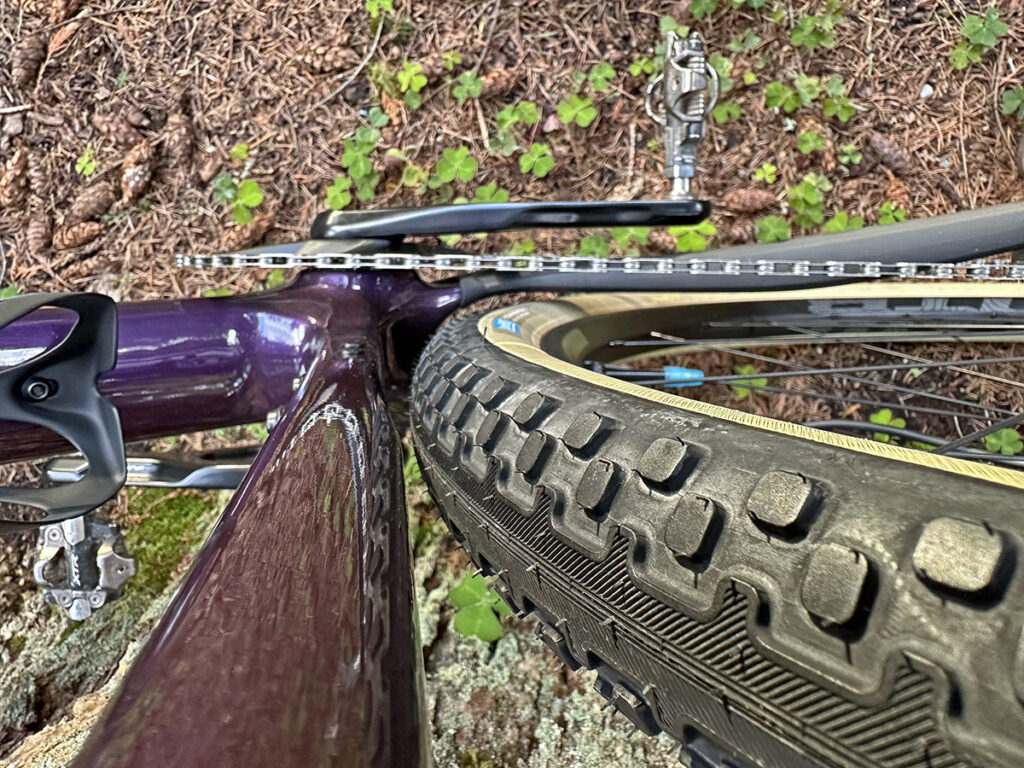 What’s new? Well, the gravel world has changed in the last 7 years. Back then, the Warbird was designed for 650B wheels if you wanted really wide tires, or 700C if you preferred narrower rubber. These days, it’s 700C all the way, and the Flyway clears 700C x 50 mm tires. That’s exactly how wide the 48 mm Poteau Mountain Extralights plumped up on our test bike’s 25 mm-wide rims (inner width). There’s plenty of clearance on the sides, but even with a carved-out seat tube, there’s a little less room on top of the tire. That compromise keeps the chainstays short (425 mm) despite the large wheels. We’ll see what happens when the tire throws some mud in there. (There’s plenty of mud in the rainy Pacific Northwest right now…)
