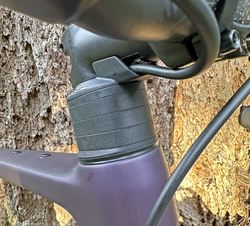 Another new feature is the Flyway’s FSA CRI headset with internal cable routing. I haven’t taken it apart yet, but from the looks of it, the cables run on the outside of the steerer tube behind these large fairings/spacers. It may not be quite as elegant as a truly internal system, but it has the advantage that the lengths of brake and dropper post lines are less critical. Removing or adding spacers below the headset is going to be a bit more involved than in the past, though.