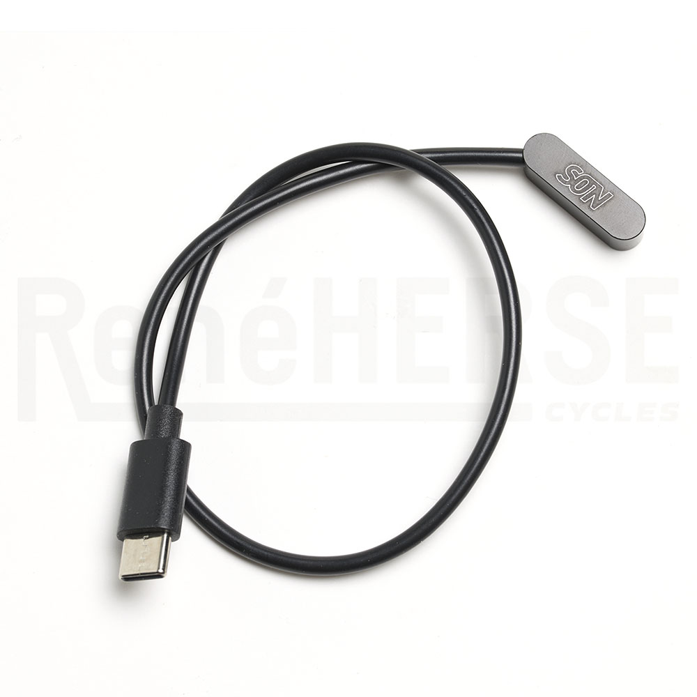 SON coaxial connectors—as on the hub above—are the gold standard when it comes to connecting electric wires on our bikes. They are secure and weatherproof, unlike many connectors that stop conducting electricity after prolonged exposure to the elements. SON headlights are available with coaxial connectors preinstalled.