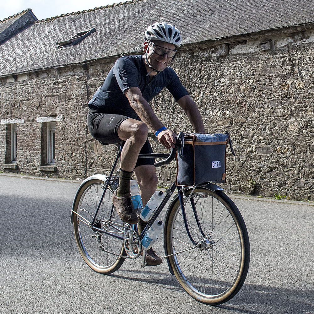 Recently, we’ve added some weight to make our handlebar bags completely waterproof—using waxed fabric—and a strap at the bottom to keep the bag securely mounted on rough gravel roads. They are still lighter than other bags, but not as light as the Concours de Machines bags. (We have a few of those left, if you want the world’s lightest handlebar bag for your bike.)