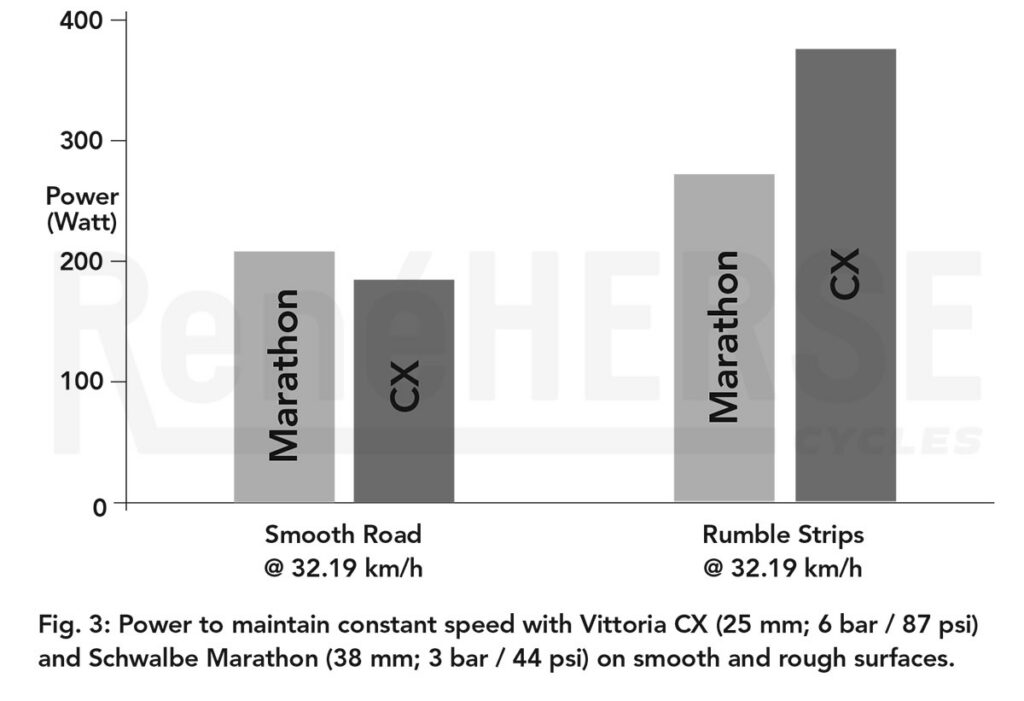 On the smooth road, the CX was faster. You’d expect that from a race tire! The Marathon required 13% more power to pedal at the same speed. That’s a difference of 24 watts at 20 mph (32.19 km/h).
