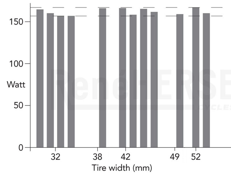 As with all testing, there’s a little noise in the data (± 4.7 watts), but the differences are not statistically significant. Most of all, there is no trend suggesting that wider tires are slower (or faster).