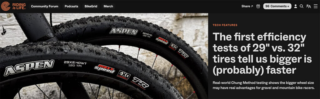 What’s remarkable in all the excitement about 32-inch wheels: There is a total absence of data to back up claims of superior performance of larger wheels. By ‘total’ I mean zero—none at all. In fact, all the data shows no performance benefits, at least for road, all-road and gravel riding. (We haven’t done any testing on mountain bikes, where other factors may be at play.)