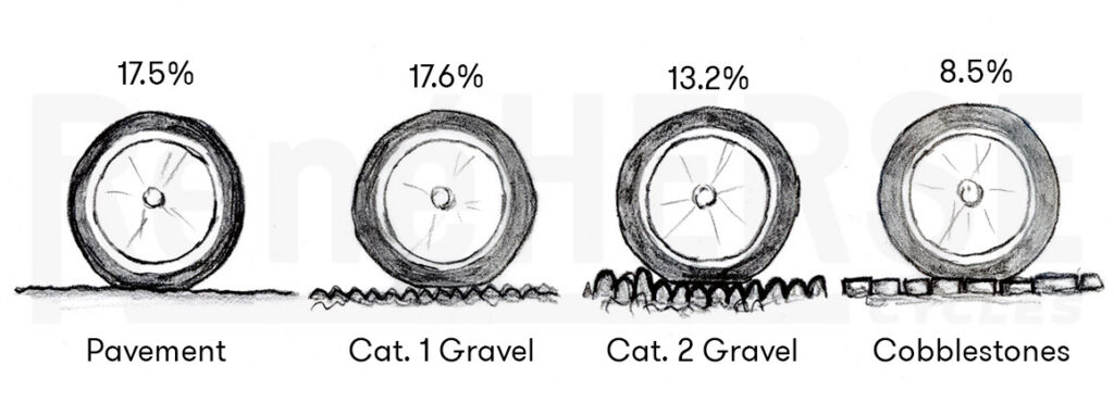 When you look at the actual data, you see that the advantage of the biggest wheels was largest on smooth pavement, and smallest on cobblestones. For the 32-inch wheels, the Escape Collective calculated an improvement of 17.5% on pavement and ultra-smooth Cat. 1 gravel, but only 8.5% on rough cobblestones. The Cat. 2 gravel was about half-way in between.