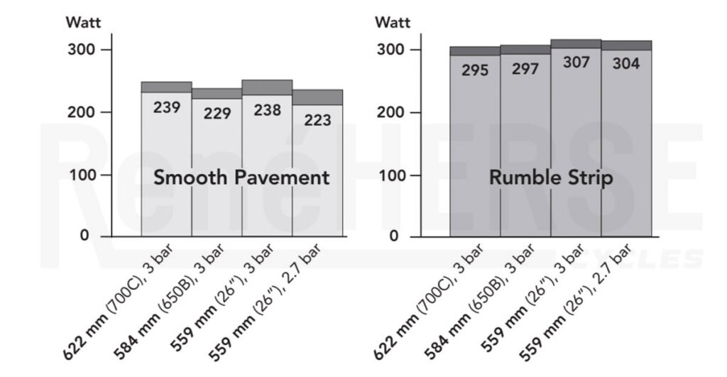 We found that small wheels roll as fast on rumble strips as the large ones. Above are the power measurements for each wheel size, plus the 26″ wheels with a slightly lower tire pressure. (We ran that as a check, to see whether small differences in tire pressure have a significant effect on our results. As expected, they didn’t.)