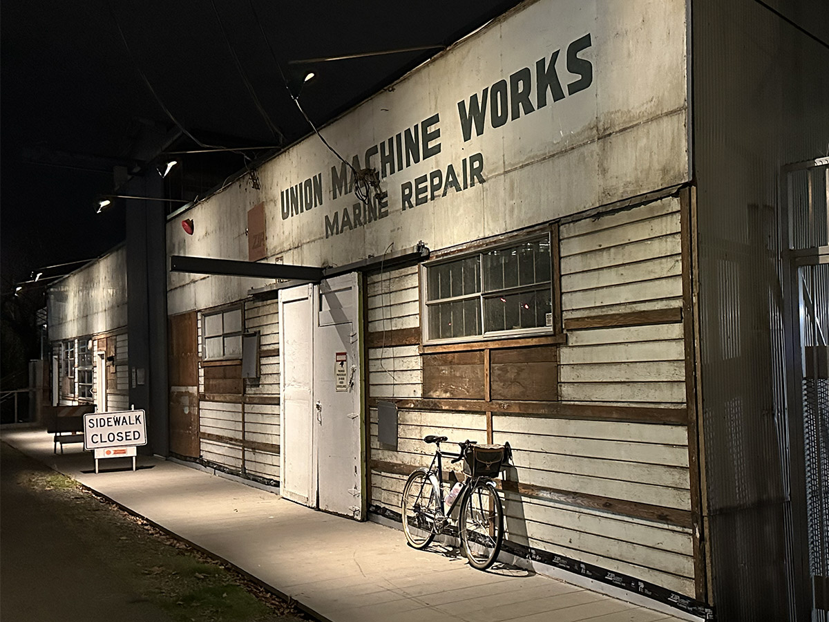 Not having to worry about traffic allows me to look around and discover interesting buildings that I’ve never noticed during daytime. Take this little machine shop on Lake Union, for example. I have ridden by here hundreds (thousands?) of times, but never noticed the shop until a recent night ride. I love the old, weathered building, and the rail for a crane that comes out over the sidewalk, to load and unload heavy parts and machines.